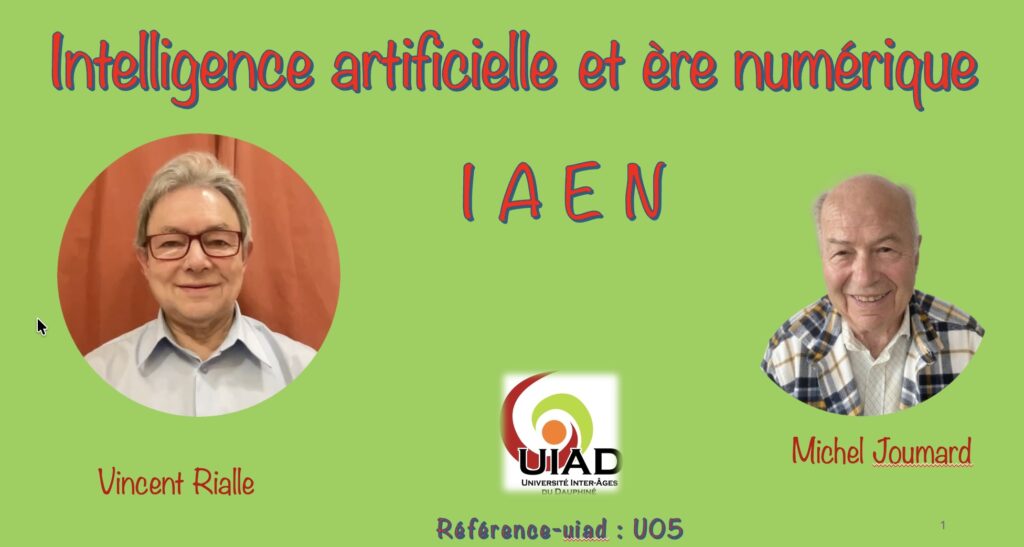 Fondé sur une première expérience de quatre années, le module IAEN – Intelligence Artificielle et Ère Numérique — mis en place par Vincent Rialle, enseignant bénévole de l’UIAD — que vous allez découvrir sur cette page web propose une initiation aux définitions, rôles et enjeux du numérique et de l’Intelligence artificielle dans la vie de tous les jours, la science, l’économie, la santé, la vie privée, l’inclusion sociale, jusqu’aux problèmes de droit international et de géopolitique.
